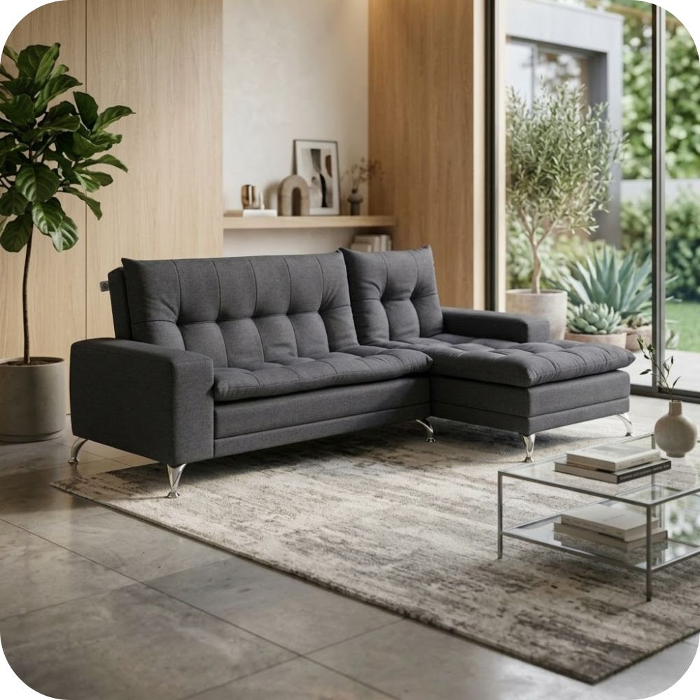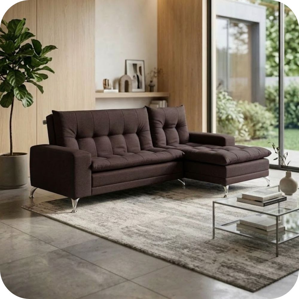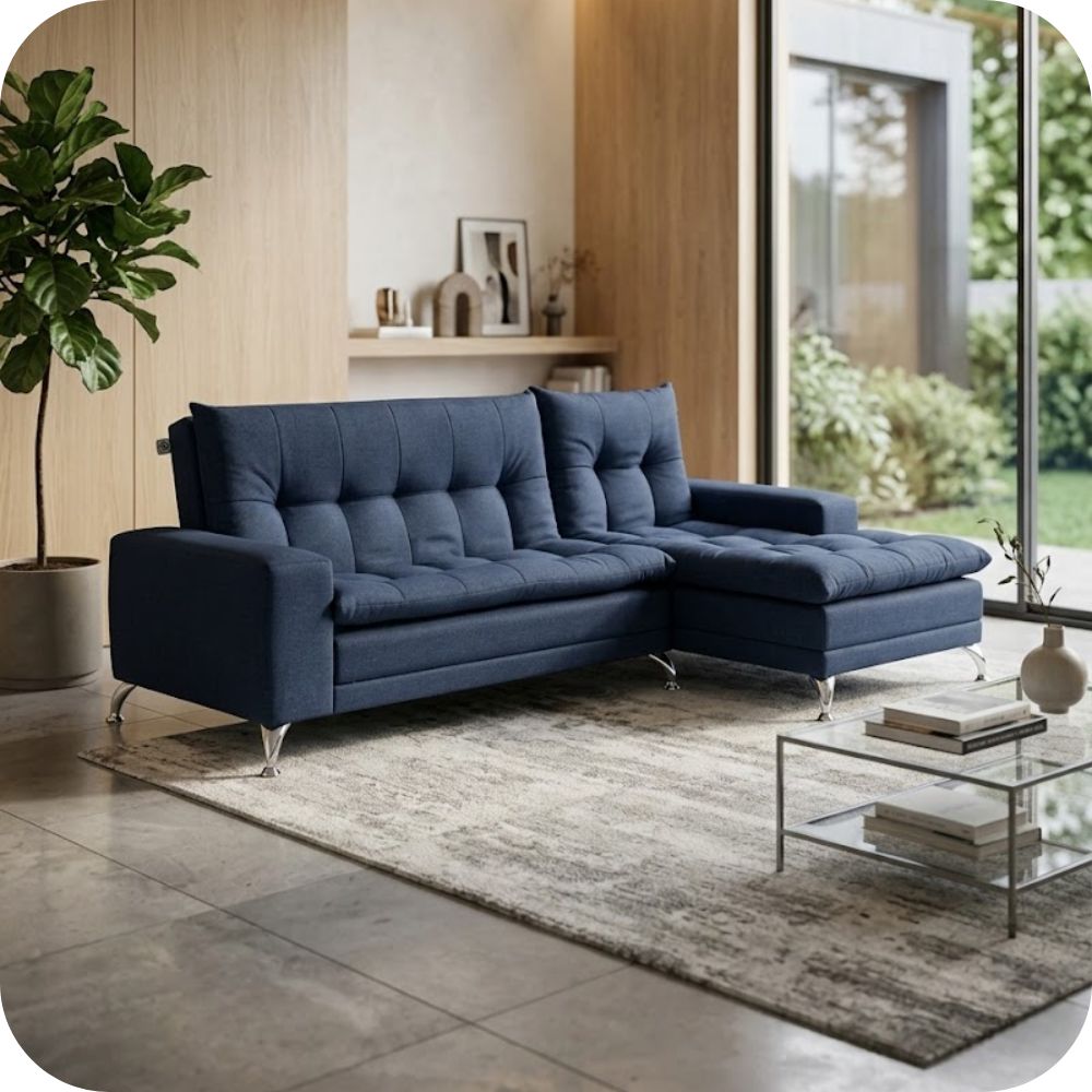 Lleva el confort al siguiente nivel con el Sofá Cama CARMEN L. Diseñada para toda la familia, esta pieza combina un amplio chaise longue con un loveseat de respaldos reclinables en 3 posiciones, transformándose en una espaciosa zona de descanso en segundos.