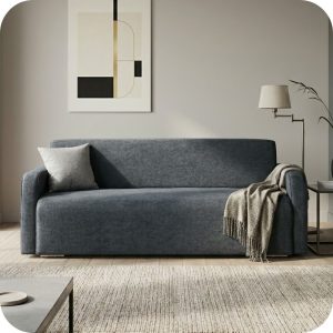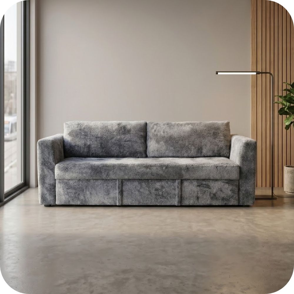 Su estética se define por líneas limpias, brazos rectos y un acolchado con costuras decorativas que resaltan su volumen y suavidad. El mecanismo interno está fabricado con acero de alta resistencia, permitiendo una transición fluida y sencilla de sofá a cama.
