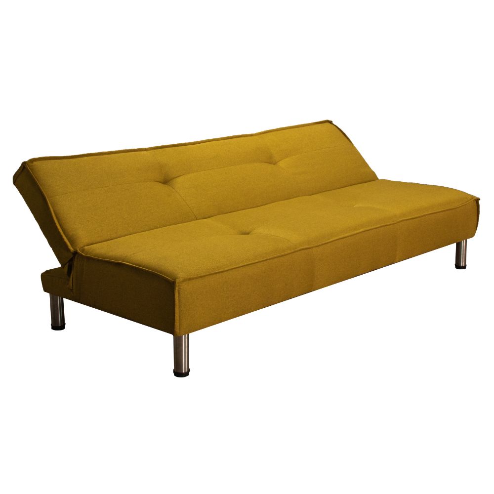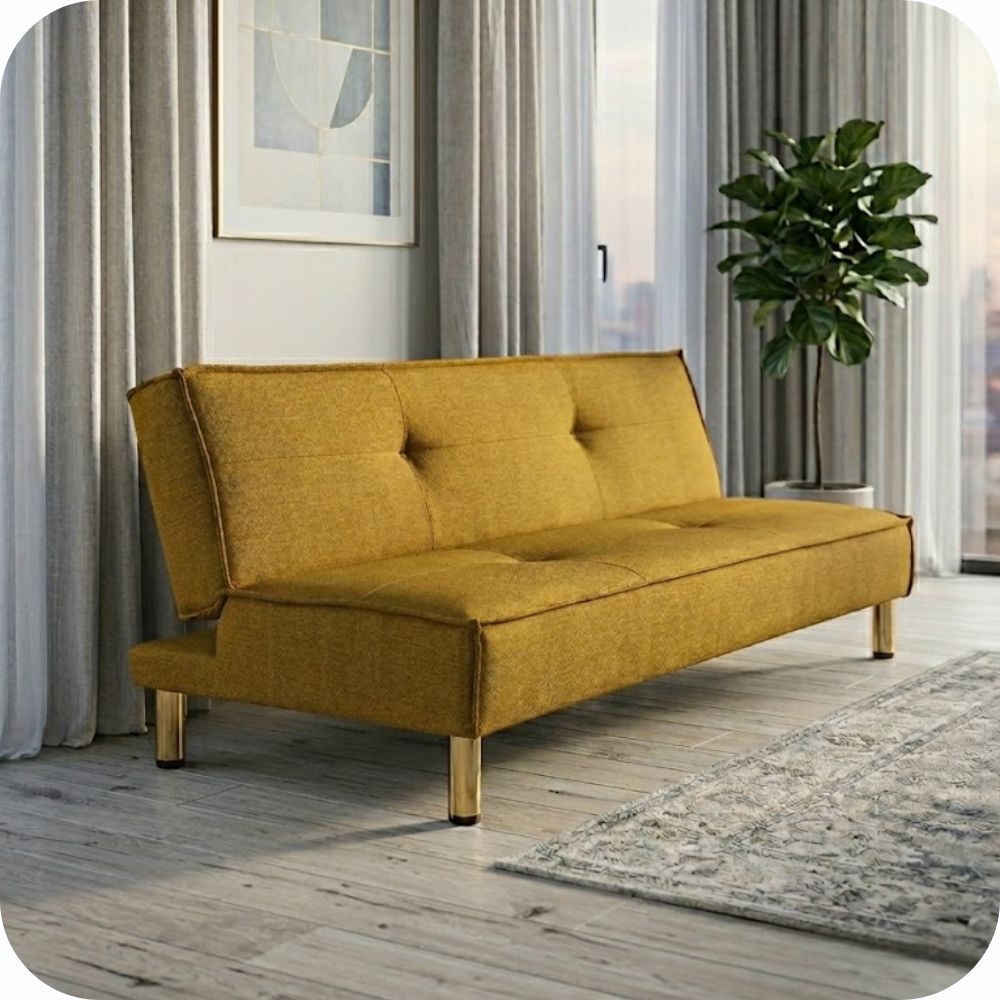 Equipado con un sistema de herraje tipo click-clack, el modelo Tomm ofrece 3 niveles de inclinación: sentado para tus actividades diarias, semi-reclinado para ver televisión o leer, y totalmente plano para convertirse en una cama individual firme y confortable. Sus patas metálicas con acabado cromado no solo aportan un contraste visual elegante con el tapizado en color mostaza, sino que también brindan una estabilidad superior y facilitan la limpieza debajo del mueble.